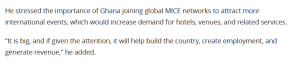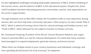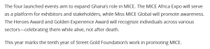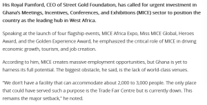 10 Sep Street Gold Foundation calls for stronger MICE infrastructure to position Ghana as West Africa’s hub Posted at 04:25h in News, Pageant by admin 1 Comment 0 Likes https://www.modernghana.com/news/1430126/street-gold-foundation-calls-for-stronger-mice.html